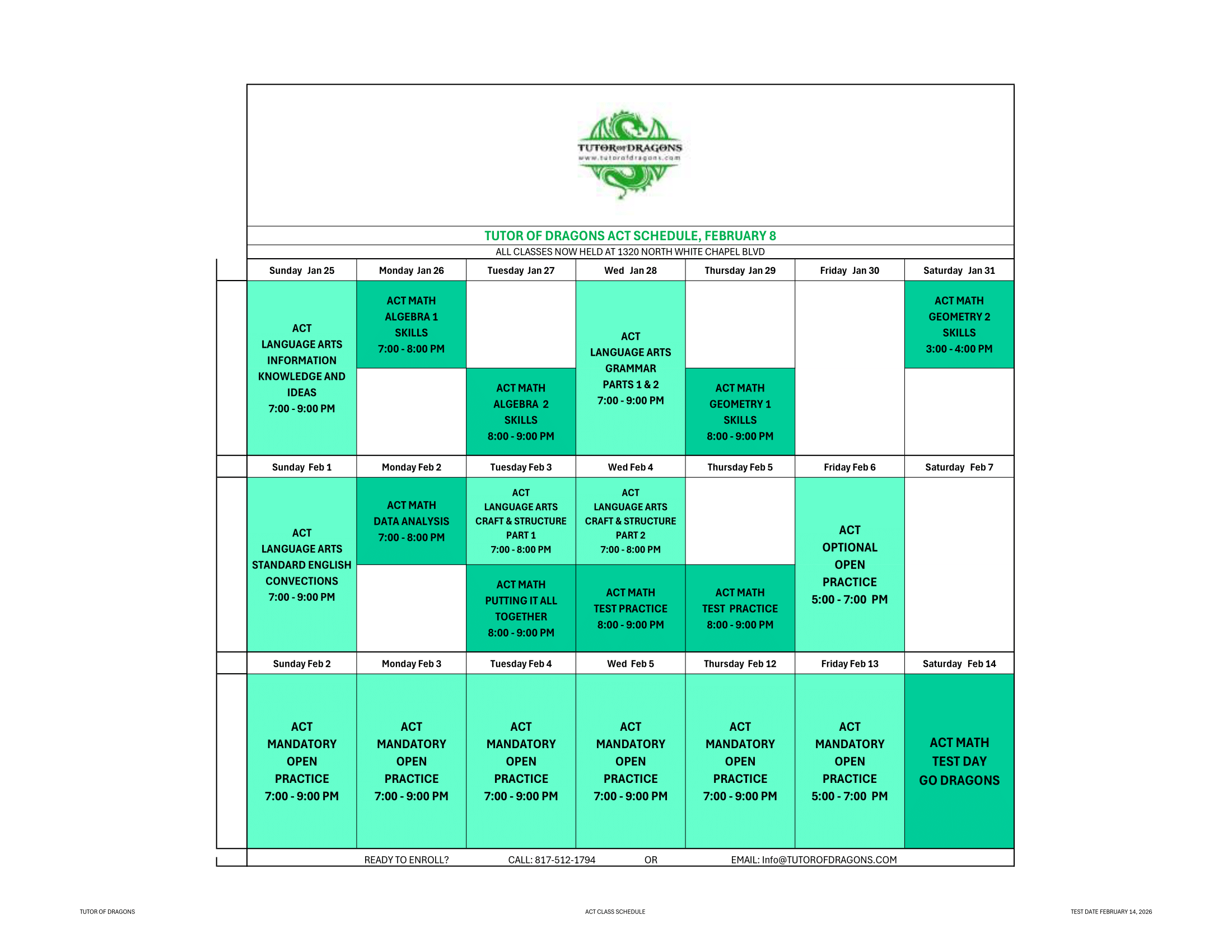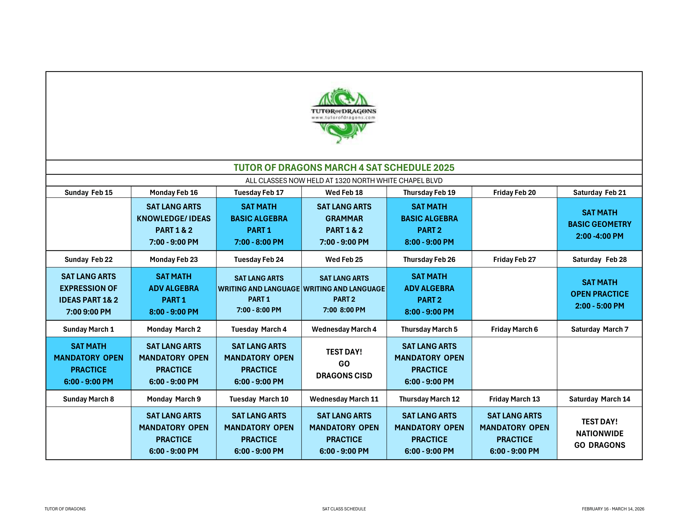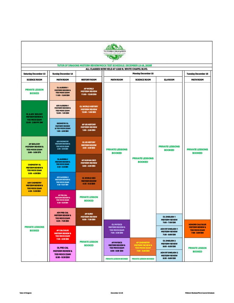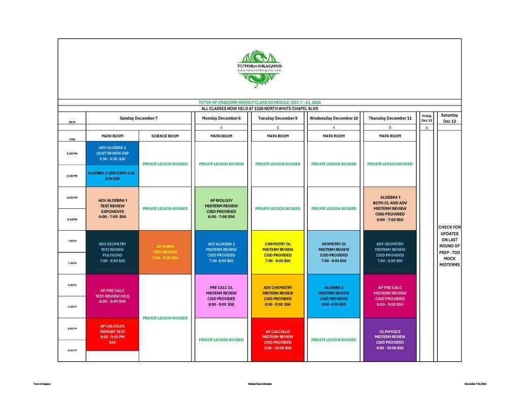 Here, you will find our weekly calendars and information on upcoming courses. We do our best to align the schedule with Carroll ISD curriculum, ensuring our students are thoroughly prepared for every twist and turn throughout the academic year. We update our calendar weekly, so remember to check back often for the latest information!
