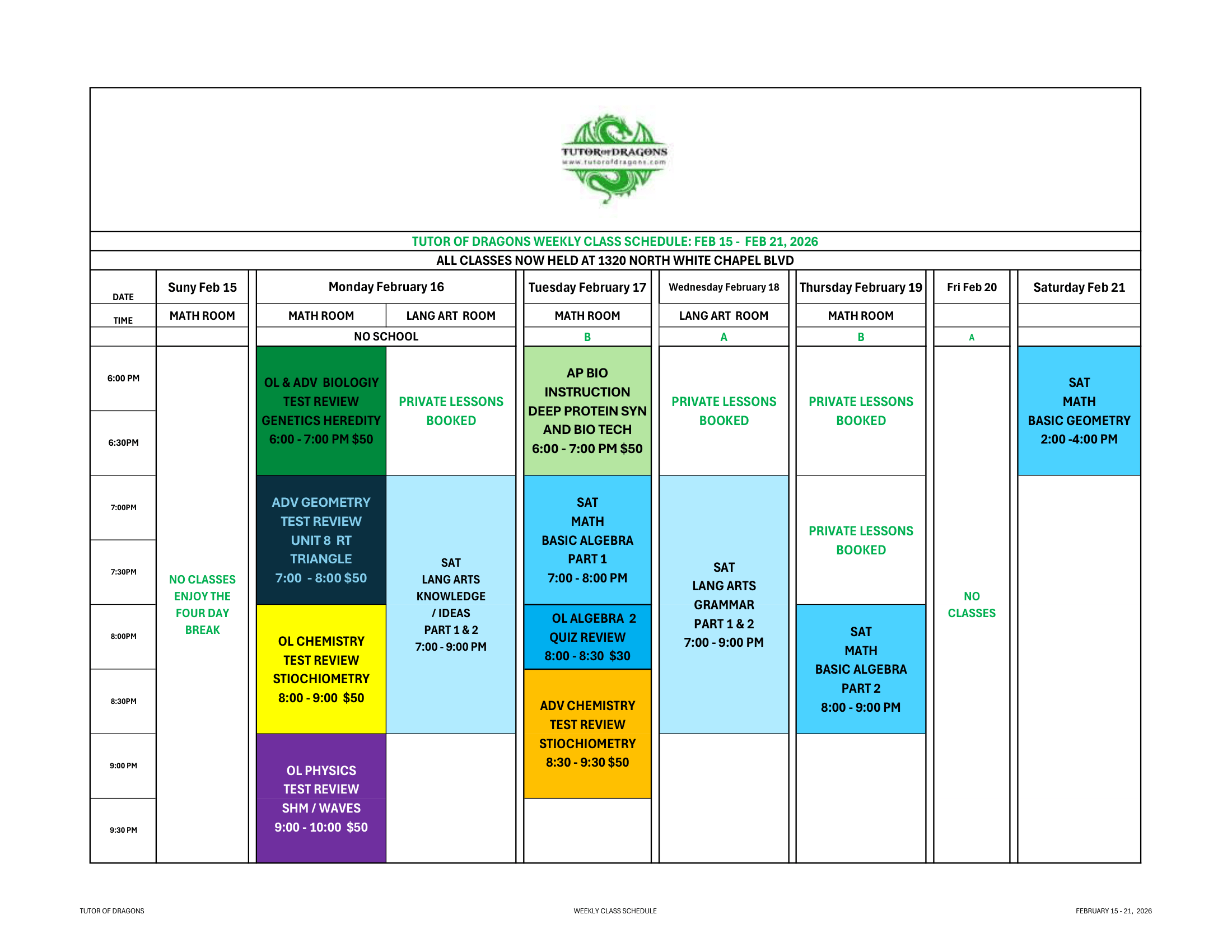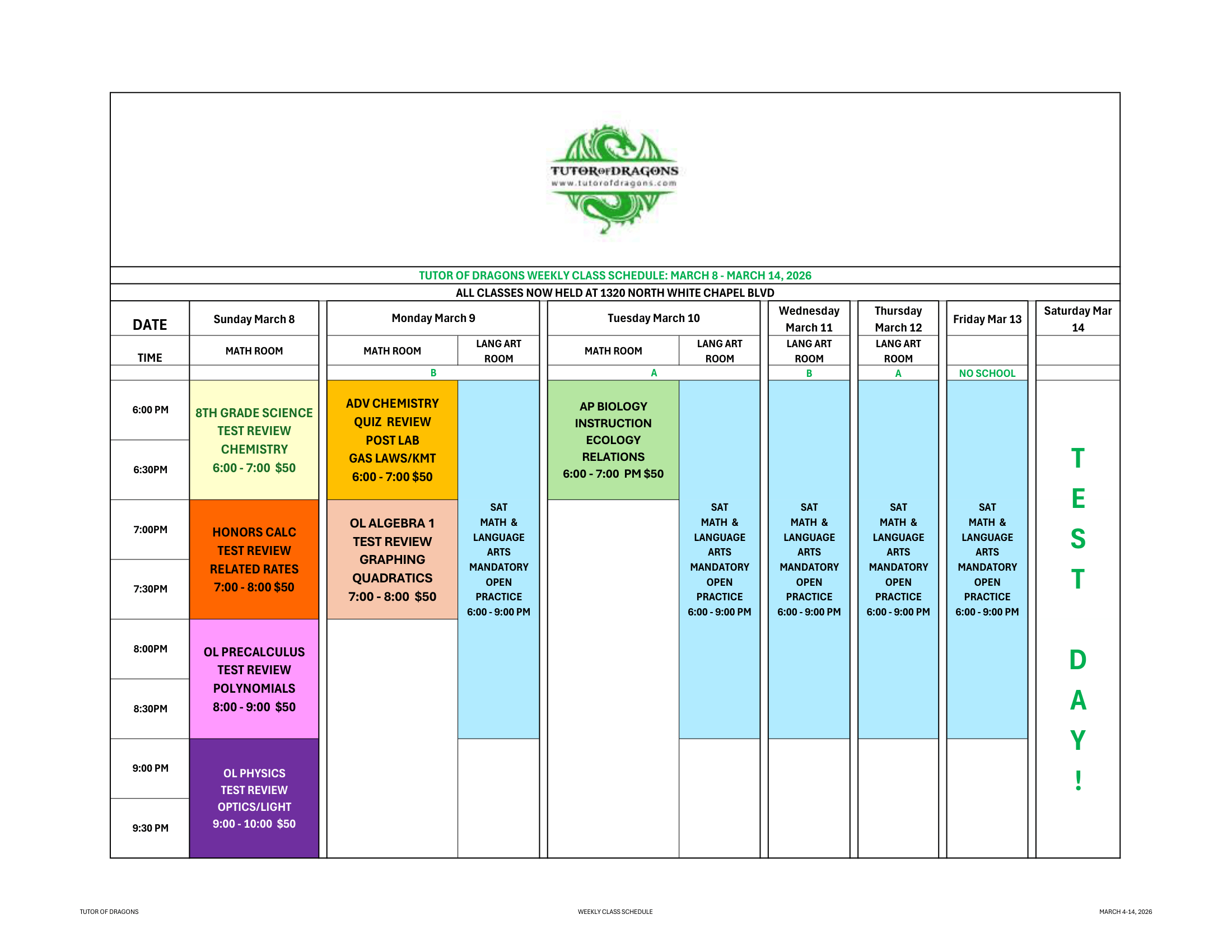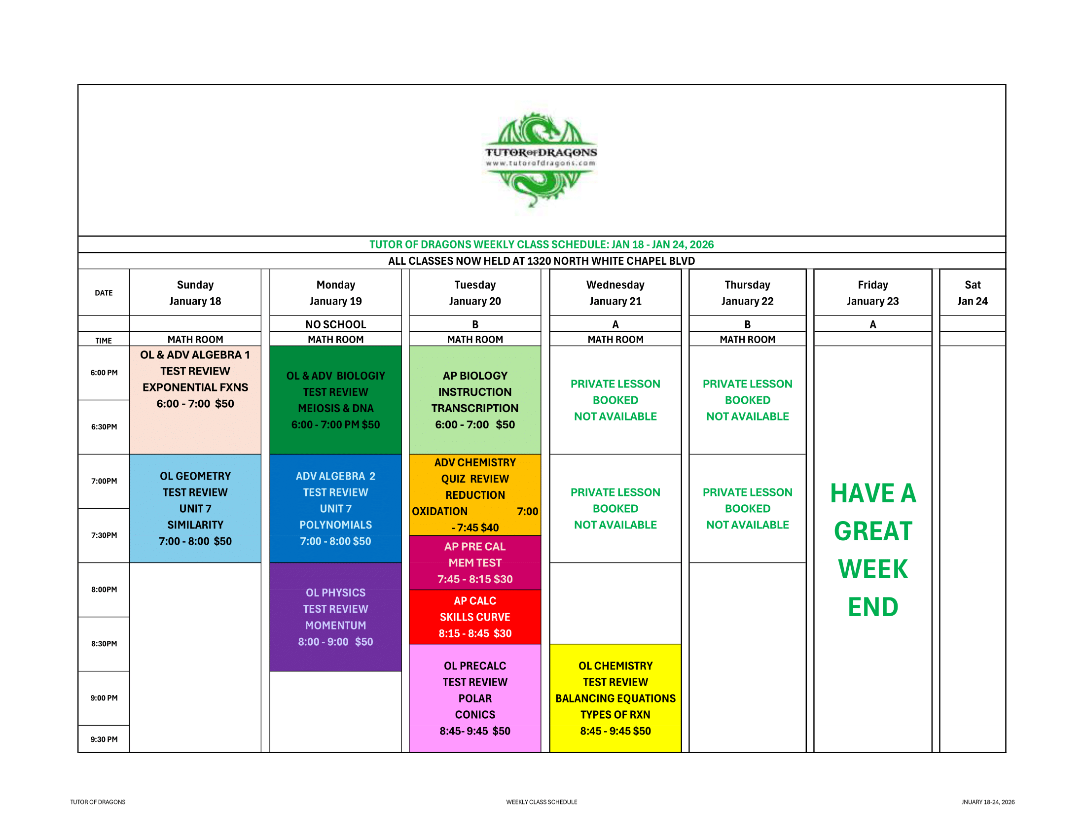 Here, you will find our weekly calendars and information on upcoming courses. We do our best to align the schedule with Carroll ISD curriculum, ensuring our students are thoroughly prepared for every twist and turn throughout the academic year. We update our calendar weekly, so remember to check back often for the latest information!